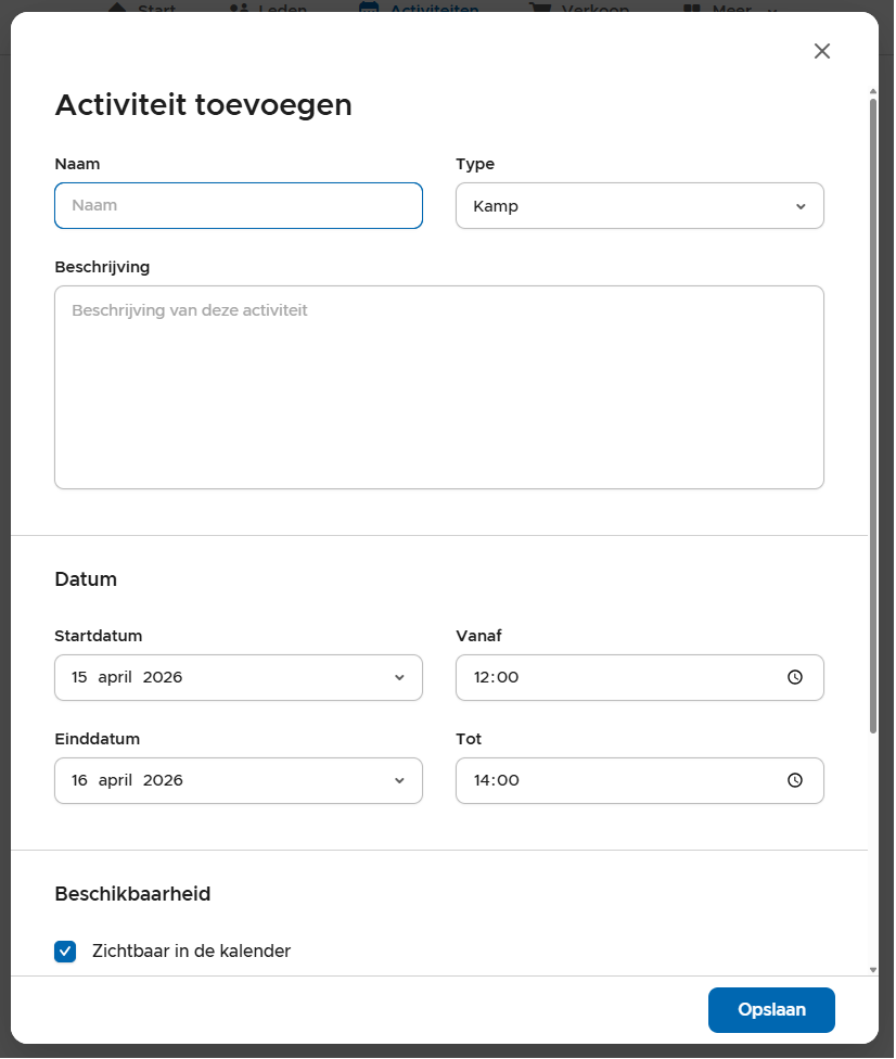 Je kan ook activiteiten aanmaken zonder inschrijvingen te verzamelen, zodat ze enkel zichtbaar zijn in de activiteitenkalender van de betreffende leden of leiding, maar je hiervoor dus geen inschrijvingen wil verzamelen (bv: wekelijkse activiteit of leidersvergadering).