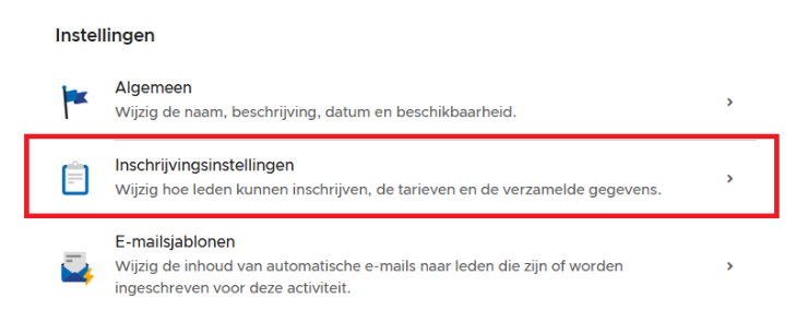 Bij de inschrijfinstellingen kan je o.a. het inschrijvingstarief van jouw activiteit instellen en nog zoveel meer: