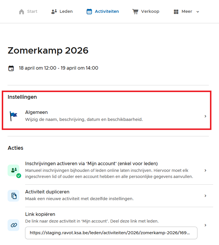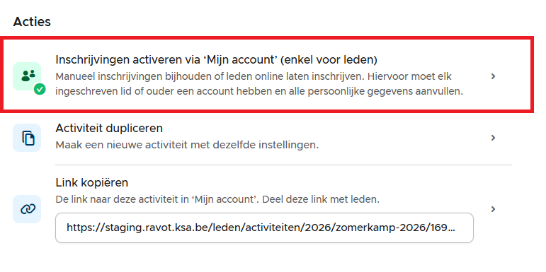 Je zal éénmalig de inschrijvingen moeten activeren bij de acties van deze activiteit als je wil dat leden of leiding zichzelf kunnen inschrijven voor deze activiteit (bv: uitstap, weekend of kamp).