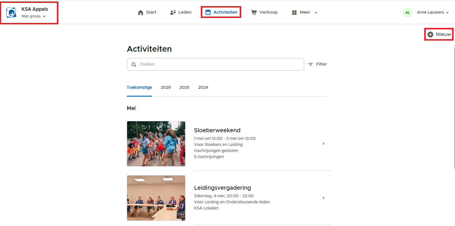 Voor een activiteit aan te maken klik je op het tabblad Activiteiten in jullie groepsportaal (Mijn groep) en daarna op de knop +Nieuw (rechts bovenaan de pagina).