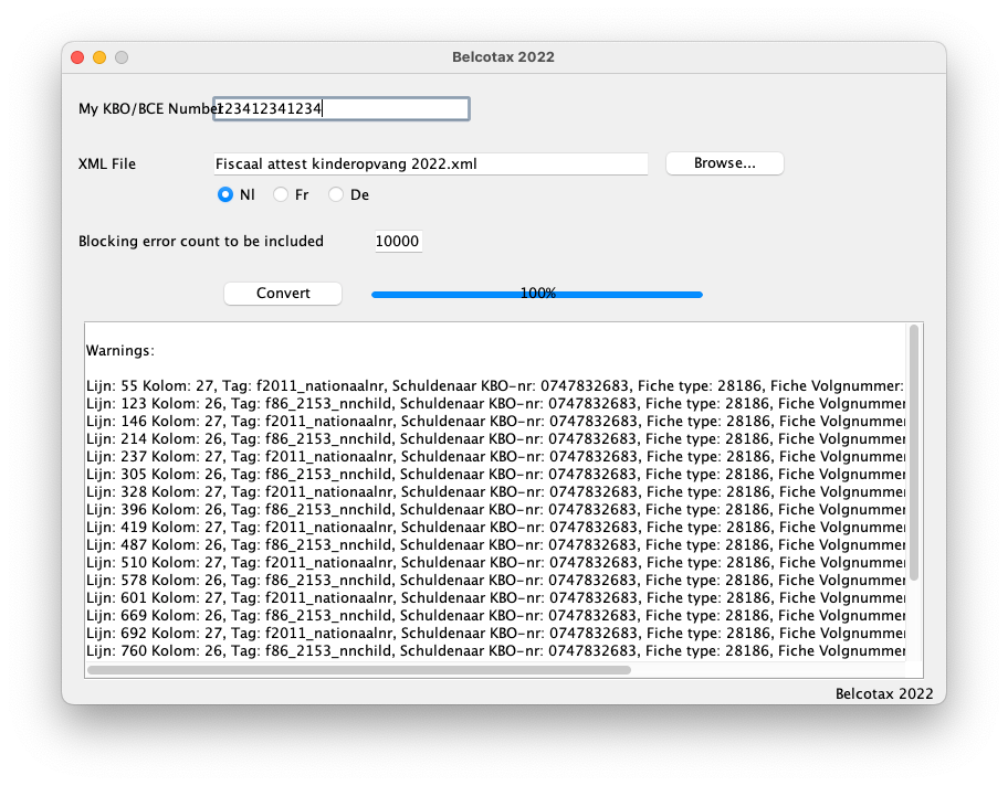 - Nu moet je het XML bestand omzetten in een BOW bestand via de validatiemodule van Belcotax. Die kan je hier downloaden. Hiervoor heb je Java nodig. Wij bieden geen ondersteuning bij het openen van dit programma*, voor vragen kan je opnieuw bij Belcotax zelf terecht en in hun handleiding. Bij het omzetten moet je erop letten dat het nog altijd mogelijk is dat je foutmeldingen krijgt. Bv. als één van de leden een ongeldig rijksregisternummer heeft opgegeven, of als de postcode ongeldig is... Zo is er ook een absurd maximum van 28 tekens op de lengte van de naam van jouw vereniging, om maar iets te noemen. In die gevallen kan je de documenten nog corrigeren en daarna opnieuw de XML exporteren.